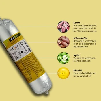 Unsere Meat-Rolls sind ein natürliches, gesundes und artgerechtes Nassfutter mit extra hohem Frischfleischanteil für ausgewachsene Hunde. Sorgfältig ausgewählte Zutaten in Lebensmittelqualität wie hochwertiges Fleisch und Gemüse und Obst sorgen für eine besonders hohe Akzeptanz und Verträglichkeit. Die Meat-Rolls werden frisch abgefüllt und schonend dampfgegart, sodass wichtige Nährstoffe erhalten bleiben. Sie enthalten außerdem immer nur eine tierische Proteinquelle (Monoprotein) und kein Getreide bzw. Gluten. Daher eignen sie sich bestens für Allergiker und ernährungssensible Fellnasen.