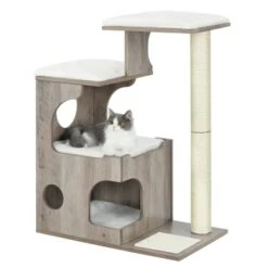 Bringt mehr Stil: Das dunkle Holzfurnier dieses Kratzbaums sowie die hierzu im Kontrast stehenden weißen Fellauflagen verleihen dem Katzenmöbel mehr Stil