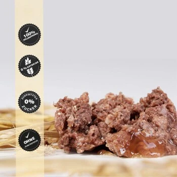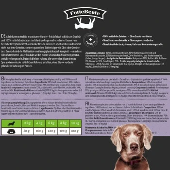 Frischfleisch in höchster Qualität und 100% natürliche Zutaten sind die Grundlage von unserem FetteBeute Nassfutter. Die rein tierische kommt nicht nur ohne Getreide, sondern ganz ohne Stärketräger wie Obst oder Gemüse aus. Dennoch ist das Hundefutter ernährungsphysiologisch komplett – ein echtes Alleinfuttermittel.
