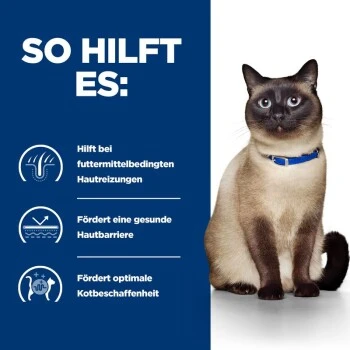 Futtermittelempfindlichkeiten und -unverträglichkeiten können zu einem ernsten Problem werden und zu Hautreizungen, Fell- und Ohrbeschwerden oder sogar Magen-Darm-Verstimmungen führen. Katzen mit Futtermittelempfindlichkeiten oder -unverträglichkeiten, auch unerwünschte Futtermittelreaktionen genannt, reagieren für gewöhnlich negativ auf das Protein in ihrem Futter. Wenn Ihre Katze an unerwünschten Futtermittelreaktionen leidet, ist es umso wichtiger, das richtige Futter zu füttern. Die Ernährungswissenschaftler und Tierärzte von Hill‘s haben die klinische Ernährung Prescription Diet z/d speziell zur Reduzierung von Haut- und Verdauungssymptomen entwickelt, die durch Futtermittelunverträglichkeiten bedingt sind. z/d ist eine klinisch erprobte Ernährung, die hilft, unerwünschte Futtermittelreaktionen zu vermeiden.