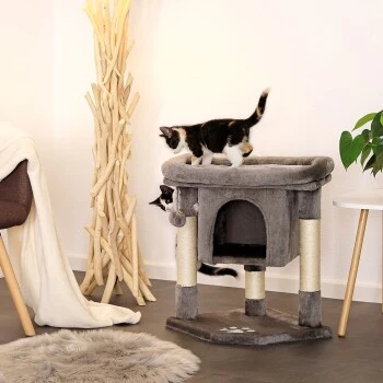 Mit diesem Katzenspielhaus aus weichem Plüsch bleiben keine Wünsche Ihrer Samtpfote offen. Die kuschelige Höhle lädt zum Ausruhen und Verstecken ein und die beiden hängenden Plüschbälle sorgen für den nötigen Spielspaß. Das einladende Liegebett ist ideal für die Ruhezeiten und das Beobachten der Umgebung. Die Stämme aus robustem Sisal unterstützen die Krallenpflege und halten Ihre Katze somit von den Möbeln fern.