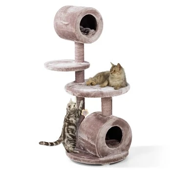 Katzen haben einen ausgeprägten Spieltrieb. Und mindestens ebenso gern ziehen sie sich auf einen höher gelegenen Aussichtsplatz oder in eine kuschelige Höhle zum Entspannen zurück. Der MORE FOR Kratzbaum Jive verbindet Spiel- und Kratzmöglichkeiten mit behaglichen Liegeplätzen.