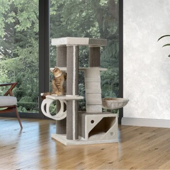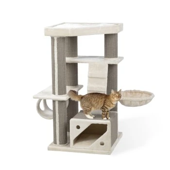Der MORE Kratzbaum Anne vereint Design und Funktionalitäten in einer hochwertigen und modernen Bauweise. Vier unterschiedliche Ebenen laden zum ausgiebigen Entdecken und Klettern ein, während das robuste Sisal dem täglichen Kratzbedürfnis Ihrer Samtpfote entgegenkommt. Mehrere großzügige kuschelige Liegeflächen bieten ideale Voraussetzungen zum Entspannen und Beobachten. Die Kletterleiter lädt zum Bewegen und Erkunden ein, während die Hängematte den Spieltrieb weckt. Selbst größere Katzen finden mit dem stabilen MORE Kratzbaum Anne ausreichend Platz zum Kratzen, Entspannen und Spielen.