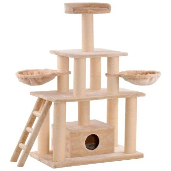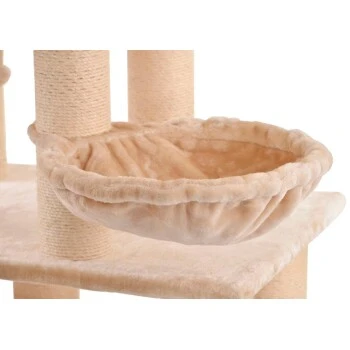 An den extra starken Holmen (Ø ca. 12 cm), die mit Natursisal umwickelt sind, kann nach Herzenslust geklettert werden. Aufgrund ihrer Größe bietet die Bodenplatte optimale Standsicherheit. Die oberen Ebenen, 2 Hängemulden und eine runde Liegegeplatte mit Halbrand laden zum Ruhen und Beobachten ein. In der geräumigen Höhle kann sich ihre Katze jederzeit zurückziehen und ein ausgedehntes Nickerchen machen. Die seitlich angebrachte Leiter erleichtert auch kleinen oder älteren Stubentigern den Aufstieg. Alle Liegeflächen sind mit samtig weichem Plüsch bezogen, der besonders dicht gewebt ist. Die hohe Qualität der verwendeten Materialien machen diesen Katzenbaum einzigartig und lange haltbar.