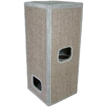 Bei dieser Kratztonne kommt jede Kralle auf ihre Kosten. Die vier stabilen Spanwände sind mit robustem Sisalgewebe bezogen und laden zur Krallenpflege, aber auch zum Klettern ein. Gleichzeitig kann die Kratztonne Maili als Rückzugsort oder zum Versteckspiel genutzt werden. Dies wird durch die drei Eingänge, die versetzt in der Höhe von 13 cm, 54 cm und 91 cm angebracht sind, ermöglicht. Das Innenleben besteht aus einer mit Plüsch bezogenen Bodenplatte (ca. 46×46 cm) und einer Liegefläche (ca. 46×46 cm) in 54 cm Höhe, die mit einem Durchgang von ca. Ø 18 cm versehen ist. Die Dachfläche ist zugleich ein erhöhter Beobachtsplatz, der mit einem weichem Plüschkissen besonders bequem ist. Die Lieferung erfolgt zerlegt mit Aufbauanleitung.