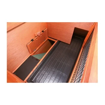 - oder getrennte Haltung durch die verschließbare, kunststoffbeschichtete Bodenluke mit je einer Rückzugsmöglichkeit auf jeder Ebene.