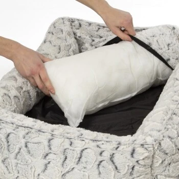 Die Seitenränder sind als gemütliche Auflage für den Hundekopf großzügig mit Polyesterwatte gefüllt. Zudem erhält das Hundebett durch die hohen Ränder eine nestartige Form. Dies vermittelt ihrem Hund Sicherheit und Geborgenheit für einen erholsamen Schlaf. Zudem wird durch die hohen Seitenränder kalte Zugluft abgehalten. Der Bezug der Seitenränder ist mit kuscheligem Fellimitat ausgestattet. Der komplette Bezug ist waschbar und durch den rundum eingenähten Reißverschluss kinderleicht zu entfernen. Der Einstieg des Manchester ist abgesenkt, damit der Zugang für den Hund leichter fällt.